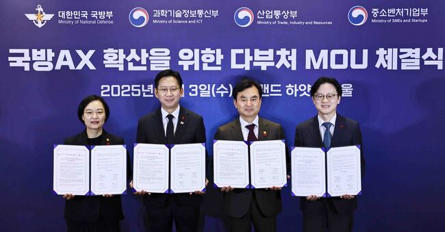 이날 국방부(장관 안규백)와 과학기술정보통신부(부총리 겸 과기정통부 장관 배경훈, 이하 ‘과기정통부’), 산업통상부(장관 김정관, 이하 ‘산업부’), 중소벤처기업부(장관 한성숙, 이하 ‘중기부’)는 ‘국방 AI 생태계 발전포럼’에서 국방·산업 분야의 인공지능전환(AX) 확산을 위한 업무협약을 체결했다.