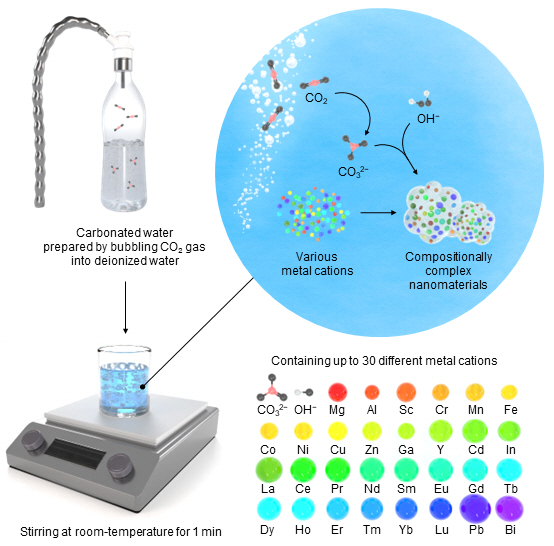 제조 과정은 간단하다. 물에 이산화탄소 가스를 주입해 탄산수를 만든 뒤 수산화물(OH⁻)을 첨가하면 물속에 녹아있던 이산화탄소가 금속과 결합하기 쉬운 탄산 이온으로 변한다. 이 상태에서 30종의 이온 상태 금속 원료가 담긴 용액을 붓고 1분간 저어주면, 탄산 이온이 다양한 금속 이온들을 순식간에 하나로 연결해 가루 형태의 나노 소재가 합성된다.