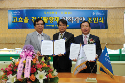 최근 (주)포스코켐텍과 태영EMC는 포스코켐텍 포항본사에서 이상영 포스코켐텍 사장을 비롯한 임직원, 김병환 태영EMC 사장 등 관계자들이 참석한 가운데 고효율 건식탈황제인 고반응소석회 생산공장 설립을 위한 합작계약을 체결했다고 밝혔다.