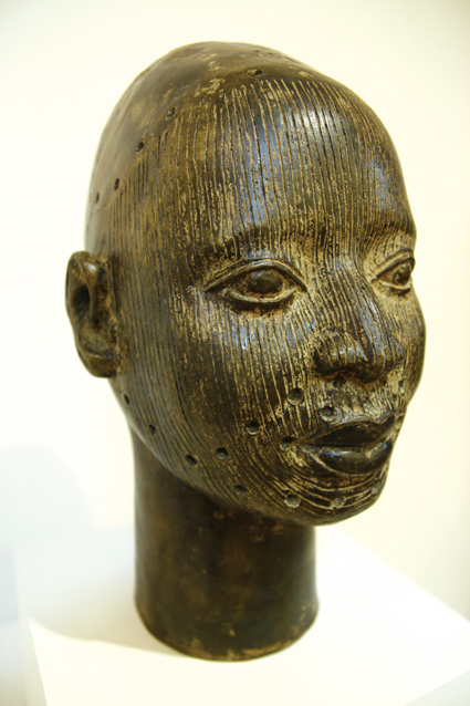 4. 「베닌 청동두상」 청동 35cm 나이지리아. 얼굴의 긴 줄무늬는 왕의 얼굴을 가린 베일을 묘사한 것이고 입주위의 구멍은 수염을 달기위한 것이다.