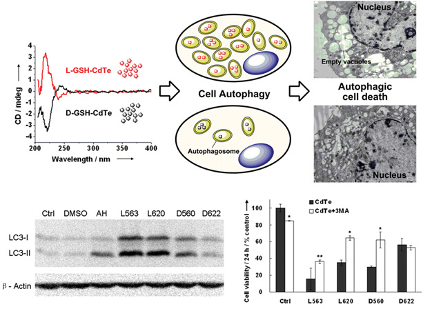키랄(Chiral) 생물분자 표면 수정된 양자점 세포독성에 대한 영향의 연구에서 연구팀은 두 개의 다른 직경의 카드뮴 텔루라이드(CdTe, cadmium telluride)양자점을 선택하여 그 표면에 각각 다른 카이랄 글루타치온(GSH, glutathione)을 수정하여 카이랄 양자점 L-GSH-CdTe와 D-GSH-CdTe를 얻었다. 각 조의 GSH-CdTe는 배양한 사람의 간암세포에 대하여 모두 카이랄과 관련된 세포독성과 세포의 자기정화 활성화(autophagy activation)현상을 나타내고, GSH-CdTe의 세포독성은 그가 유도한 자기정화 능력과 관련된다.