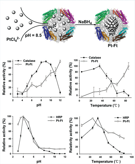 최적 pH는 모두 4이고, 최적온도도 매우 비슷하다. 이런 독특한 성질은 apoFt가 합성한 Pt나노입자 Pt-Ft의 생물의학과 환경과학 등 분야에서의 좋은 응용전망을 가지게 한다. 이번 연구결과는 최근의 Biomaterials (2011, 32, 1611-1618)에 발표했다.