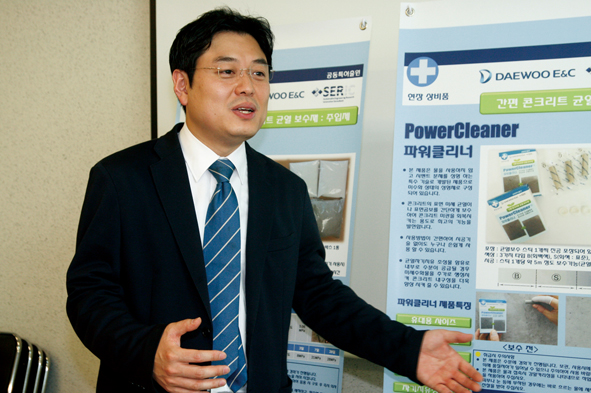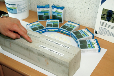 특히 ‘파워클리너’ 제품은 균열부에 물을 뿌리고 분필 형태의 보수재를 문질러 바르는 간단한 방식으로 건설 현장 뿐 아니라 가정에서도 손쉽게 사용할 수 있다. 안태호 박사는 “현재 출시된 제품은 건식 콘크리트에 사용할 수 있다”며 “습식 콘크리트에 사용할 수 있는 자기치유 보수재도 개발 중”이라 밝혔다.