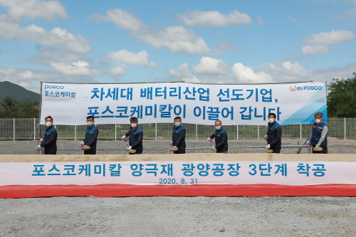 포스코케미칼은 전남 광양시에서 양극재 광양공장 3단계 확장 건설 공사의 착공에 들어갔다고 지난 8월 31일 밝혔다. 이날 착공식에는 손동기 양극소재실장을 비롯한 사업 관계자가 참석했으며, 코로나19 방역 수칙을 준수한 가운데 간소하게 진행되었다.