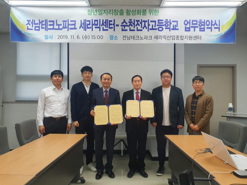 전남테크노파크(원장 유동국) 세라믹산업종합지원센터는 지난달 6일, 순천전자고등학교와 지역 청년 일자리 창출을 위한 업무협약(MOU)를 체결했다고 밝혔다. 이날, 협약식에는 김광진 전남테크노파크 세라믹산업종합지원센터장, 정병원 순천전자고등학교장 등 관계자 10여명이 참석했다.
