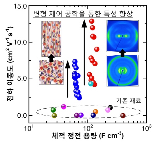 연구팀은 이러한 문제점을 개선하기 위해 PEDOT:PSS 기반 전도성 고분자 미세섬유 내 결정구조를 한 방향으로 정렬시켜 기존 동일재료 기반 소자(490 F cm-1V-1s-1)에 비해 3배 이상의 트랜지스터 특성 평가지수를 갖는 트랜지스터(1500 F cm-1V-1s-1)를 구현하였다.