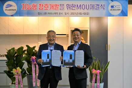 안현우 소프트피브이 대표(왼쪽)와 양경국 하우스머치 대표가 6월 4일 지능형 창호개발을 위한 MOU 체결식에서 협약서를 들고 기념 촬영을 하고 있다.(자료제공: 소프트피브이)