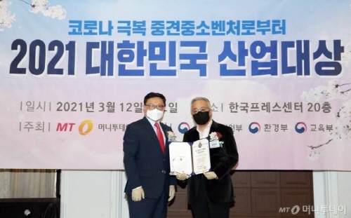 안현우 대표가 대한민국산업 대상식에서 ‘기술혁신상’을 수상하고 기념촬영을 하고 있다.(자료제공: 소프트피브이)