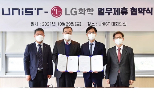 양 기관은 10월 29일 탄소중립, 바이오매스 등 Sustainability 관련 분야와 전지소재 및 인공지능(AI) 분야 공동연구 개발을 위한 업무협약(MOU)을 체결했다고 밝혔다. 이날 오전 울산 UNIST 본관에서 진행된 협약식에는 LG화학 CTO(최고기술책임자) 유지영 부사장과 UNIST 이용훈 총장 등이 참석했다.