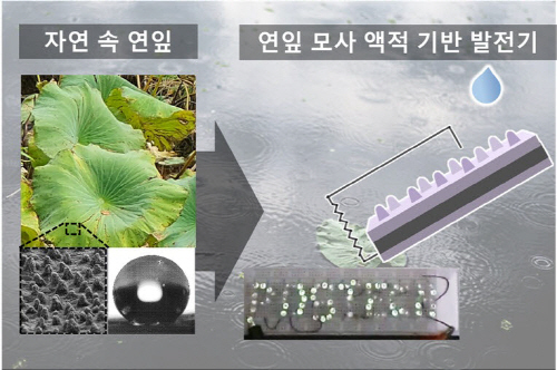 연구팀은 표면이 물에 젖지 않는 연잎에 주목했다. 미세한 돌기로 덮여 있는 연잎은 물이 스며들지 않고 동그랗게 뭉쳐 미끄러지는데, 몇 마이크로리터에 불과한 물방울까지도 흡수하지 않고 튕겨낸다. 이때 빠르게 튕겨내는 에너지를 이용하면 전기를 만들어낼 수 있다. 물방울이 표면에 붙은 오염물질을 닦아내, 항상 깨끗함을 유지하는 것은 물론이다.