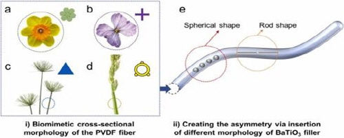 에너지융합연구부 임상규 책임연구원 연구팀은 용융방사 기술을 이용하여 식물의 꽃과 줄기 형태(수선화, 무꽃, 파피루스줄기, 사초 줄기)를 모사한 단면 형태가 균일하게 제어된 나노막대 형태의 타이타늄산바륨이 함유된 PVDF(Polyvinylidene fluoride) 섬유를 제조하였다. 이를 통해 섬유의 표면적을 향상시키는 동시에 전기를 생성하는데 유리한 섬유의 결정성(crystallinity)을 증가시켜 압전 성능을 향상시킨다는 것을 규명했다.