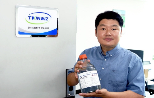 한국재료연구원 연구소기업으로 설립된 주식회사 트윈위즈 대표 김창수 박사가 개발한 액상형 항균/항바이러스 첨가제를 들고 기념촬영을 하고있다. (자료제공: 재료연)
