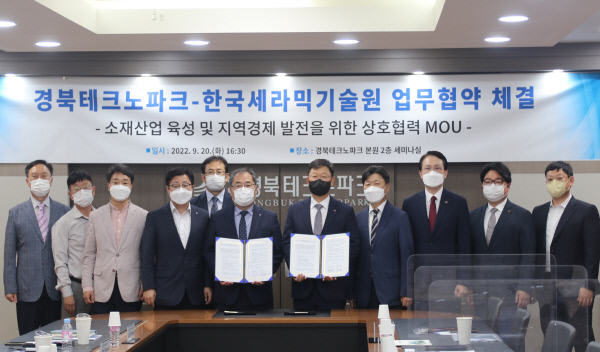 (재)경북테크노파크(경북TP, 원장 하인성)는 지난달 20일 경북TP 본원 2층 세미나실에서 한국세라믹기술원(원장 정연길)과 소재산업 육성 및 지역경제 발전을 위한 상호협력 업무협약(MOU)을 체결했다고 밝혔다.