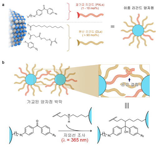 연구팀은 기존 양자점 표면의 분산 리간드에 광가교 리간드3)를 도입하여 별도의 감광제4) 및 가교제 등의 첨가물 없이 양자점만으로 패턴화가 가능한 이중 리간드 양자점 소재 기술을 제시하였다. 광가교 리간드가 도입된 양자점 박막에 자외선을 조사하면 이웃한 양자점의 리간드 간 가교가 일어나며, 양자점 박막은 회로 패턴 형성 공정에 사용되는 용매에 대하여 구조적 저항성을 가지게 된다.
