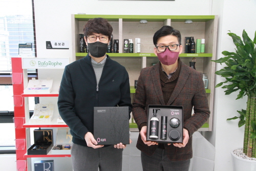 <성대경 한국세라믹기술원 책임연구원(왼쪽)과 황기철 라파로페 대표가 공동 개발한 기능성 화장품을 들고 기념 촬영하고 있다.>(자료제공: KECET)