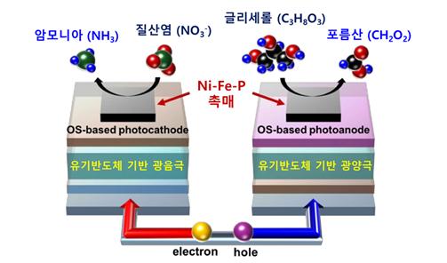 연구팀은 유기반도체 기반의 광전극과 니켈-철-인(Ni-Fe-P) 촉매를 결합한 광전기화학(Photoelectrochemical) 시스템을 개발해, 바이오디젤 산업에서 발생하는 주요 폐기물인 글리세롤과 질산염(NO₃⁻)을 각각 포름산(개미산)과 암모니아로 동시에 전환하는 데 성공했다.