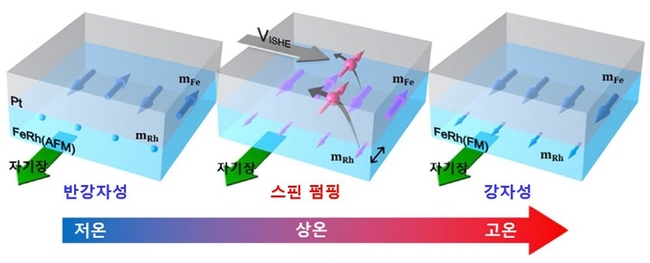 ‘철(Fe)-로듐(Rh)’ 물질이 (좌)저온에서의 반강자성 상태에서 (우)고온에서의 강자성 상태로 자기적 상태가 급격하게 변화하는 과정해서 (가운데)상온 부근에서 스핀의 크기가 급격히 변하는 순간에 생성된 ‘스핀 전류’가 인접한 비자성 물질인 백금(Pt)으로 전달되어 유도된 전압을 측정함으로써 스핀 전류를 확인함. (자료제공: 과기정통부)
