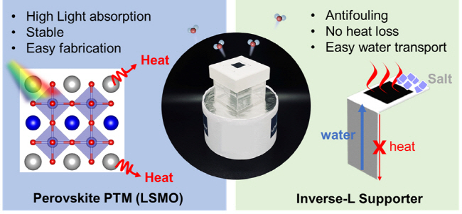 연구팀이 개발한 증발 장치는 ‘ㄱ’자 모양의 종이로 이뤄져 있다. 종이는 리트머스 시험지처럼 물을 빨아들이는 성질이 있어 바닷물이 종이 기둥을 타고 위로 스며 오르게 된다. 올라온 바닷물은 종이 윗면에 발라진 뜨거운 광열흡수체와 만나 빠르게 수증기로 바뀐다. 광열흡수체는 햇빛을 받아 발열하는 소재로, 연구팀이 사용한 페로브스카이트 소재(La₀.₇Sr₀.₃MnO₃, LSMO)는 발열 효율이 높아, 일반적인 해수의 증발 속도보다 8~10배 빠르게 물을 증발시킨다.