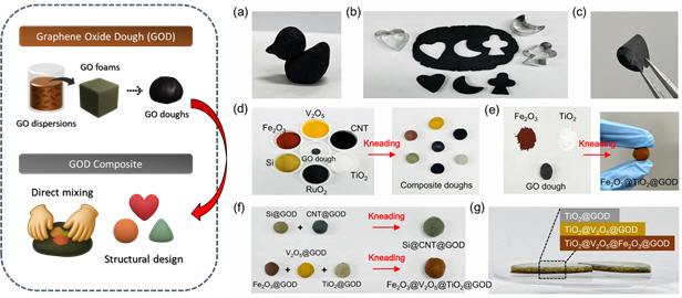 흑연에서 얻은 그래핀 산화물을 점탄성 반죽(dough) 형태로 만든 뒤, 금속산화물․나노입자, 탄소나노튜브 등 다양한 나노소재를 한꺼번에 섞어 복합화할 수 있는 방식이다. 이 과정은 2원계(binary)에서 다원계(multicomponent) 조성까지 유연하게 확장할 수 있으며, 전기화학 활성, 전도성, 자성, 전자파 차폐 등 원하는 특성을 자유롭게 조율할 수 있다.