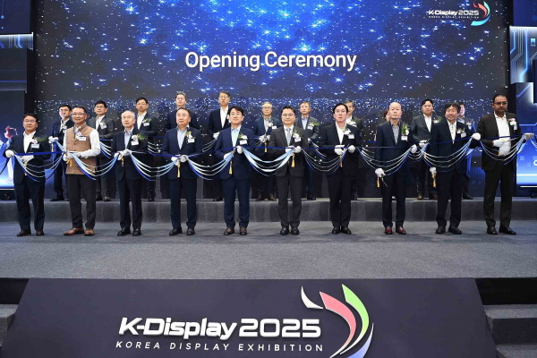 개막식에서 열린 K-Display Awards에서는 6개 기업이 산업 부 장관상을 수상했다. LG디스플레이는 자동차용 슬라이 더블 OLED, 삼성디스플레이는 초슬림 베젤·저소비전력 패 널 기술로 수상했다. 솔루스첨단소재는 OLED 유기발광 소 재, 이엘피는 XR용 마이크로LED 검사장비, 파인원은 OLED Mask 토털 솔루션, 칼리버스는 차세대 메타버스 3D 필름으 로 각각 성과를 인정받았다.