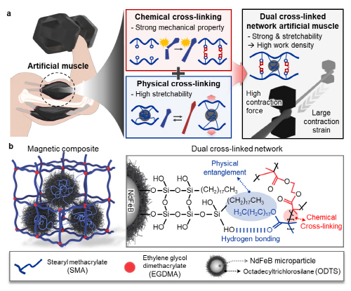 연구팀은 근육 안에 두 가지 형태의 결합이 나타나도록 형상기억고분자 소재를 설계해 이 문제를 해결했다. 근육의 화학적 결합은 고분자 사슬을 공유결합으로 단단히 묶어 구조적 강도를 유지하게 하고, 물리적 결합은 열 자극에 따라 끊어졌다 다시 이어지며 근육을 유연하고 잘 늘어나게 만든다.