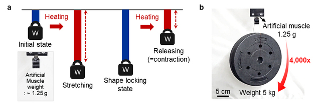 연구팀이 개발한 소프트 인공 근육은 하중을 지탱해야 하는 상태에서는 딱딱해지고, 이를 들어올려야 하는 상황에서는 부드러워져 수축할 수 있다. 딱딱한 상태에는 무게 1.25g에 불과한 이 인공 근육이 5kg 하중을 지탱할 수 있다. 자기 무게의 약 4,000배를 버티는 셈이다. 반면 부드러운 상태에서는 12배까지 늘어난다.