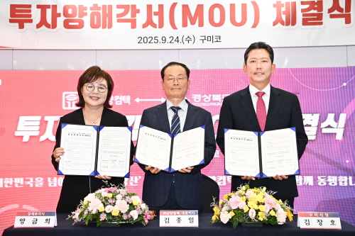 구미시(시장 김장호)는 9월 24일 구미코 경북라운지에서 2025 항공방위물류박람회(GADLEX) 개막 행사 전에 양금희 경상북도 경제부지사, 김장호 구미시장, 박교상 구미시의회 의장, 김종일 대표이사 등이 참석한 가운데 ㈜삼양컴텍과 경상북도·구미시 간 투자양해각서(MOU)를 체결했다고 25일 밝혔다.