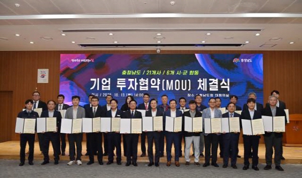 김태흠 지사는 10월 13일 도청 대회의실에서 김석필 천안시장권한대행 등 6개 시군 단체장, 한민석 웨이비스 대표이사 등 21개 기업 대표 등과 투자협약을 체결했다.