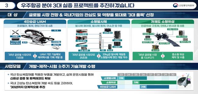 그림 2. 우주항공용 탄소섬유복합재 3대 실증 프로젝트(산업통상자원부2022. 12)[1]