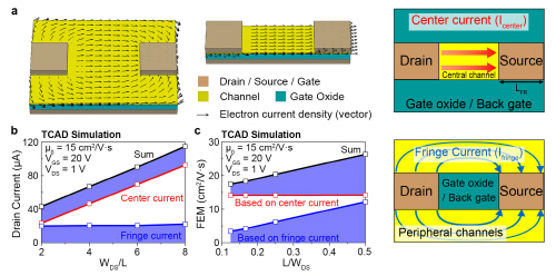 연구진은 그 원인으로 ‘샛길’로 흐르는 프린지 전류(fringe current)를 지목했다. 박막트랜지스터 소자에서 전류는 ‘소스 전극’으로 들어와 정식 통로인 ‘채널’을 거쳐 ‘드레인 전극’으로 빠져가는 형태다. 그런데 채널 폭이 전극보다 훨씬 넓을 경우, 전류가 전극 바로 아래의 본래 통로뿐만 아니라 전극 바깥의 넓은 주변부(샛길)로까지 퍼져 흐르는 ‘프린지 전류’가 생기는 것이다. 측정 장비는 이 모든 전류를 합산해 성능을 계산하므로 실제보다 부풀려진 결과가 나오게 된다.