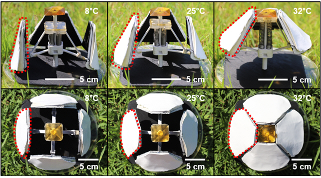 구체적으로, 소자의 3차원 구조가 닫히면 표면이 태양열을 반사하고 중적외선을 방출해 냉방 모드로 작동한다. 반대로 구조가 열리면 태양빛을 흡수하는 흑색 표면이 노출되어 난방 모드로 전환된다. 즉, 계절이나 외부 온도 변화에 따라 별도의 조작 없이도 스스로 냉방과 난방 기능을 오가며 건축물의 에너지 소비를 줄일 수 있다.