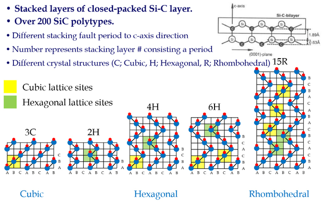 SiC는 Si와 C의 화합물로 공유결합과 부분적 이온결합으로 이루어진 화합물이다. 대표적인 결정형으로는 입방형(Cubic), 육방형(Hexagonal), 능면형 (Rhombohedral)이 존재한다. 이러한 SiC 결정다형(Polytype)들은 결정구조가 다를 뿐만 아니라 적층 주기에 따라 다른 특성을 가지고 있으며, 그림 1에 SiC의 주요 결정다형을 도시하였다.