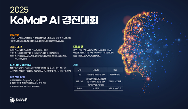 이번 대회는 소재 디지털 데이터 플랫폼(KoMaP)에 축적된 데이터를 활용하여 AI 모델을 개발하는 행사로, 구축해 놓은 소재 데이터의 활용성을 높이고 소재 개발 관련 혁신 서비스를 발굴하고자 마련됐다.