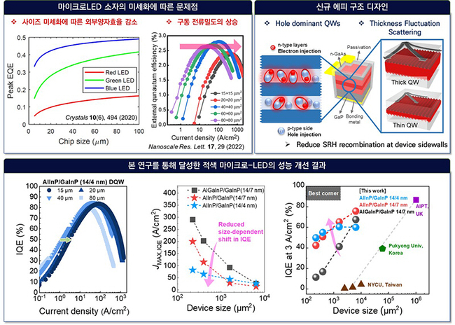 연구팀은 이러한 문제를 동시에 해결했다. 먼저 알루미늄 인듐 인화물/갈륨 인듐 인화물(AlInP/GaInP) ‘양자우물 구조’를 적용해, 픽셀이 작아져도 에너지 손실이 거의 없는 고효율 적색 마이크로LED를 구현했다. 쉽게 말해, 양자우물 구조는 전자가 밖으로 빠져나가지 않도록 ‘에너지 장벽’을 세워 빛을 내는 공간에 가둬두는 기술이다. 이로 인해 픽셀이 작아져도 에너지 손실이 줄고, 더 밝고 효율적인 적색 마이크로LED 구현이 가능해진다.