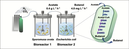 연구팀이 개발한 미생물 전환 시스템은 두 미생물의 반응을 마치 공장의 연속 생산 라인처럼 연결해 이산화탄소로 부탄올을 생산한다. 기체 전환에 능한 아세토젠균이 이산화탄소(CO₂)를 먹고 단순한 구조의 아세트산(CH₃COOH)을 1차 생산하면, 복잡한 분자 합성에 특화된 대장균이 이를 이어받아 최종적으로 부탄올(C₄H₉OH)이 완성되는 구조다.