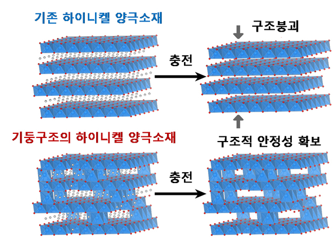 연구팀은 충·방전을 반복해도 배터리 내부 구조가 쉽게 무너지지 않도록 설계된 새로운 기술을 개발했다. 배터리 초기 구동 과정에서 전기를 가해 원자 배열을 재구성하고 이를 통해 내부 층과 층 사이를 지탱하는 ‘원자 기둥’을 형성해 구조 붕괴를 억제했다. 이를 통해 고니켈 양극 소재에서도 내부 균열 발생이 크게 줄어들었고 장시간 안정적인 구조를 유지할 수 있었다.
