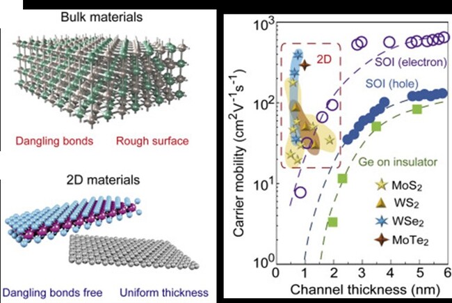 그림 2. 벌크 실리콘 대비 2차원 소재의 구조적, 전기적 특성의 이점[12]