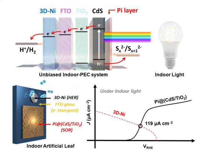 황화물은 강한 빛에 노출되면 ‘광부식’ 현상이 일어나는데 약한 실내 조명은 이를 최소화할 수 있다. 연구팀은 빛이 약해 줄어든 전하 입자량을 보완하기 위해 황화물에 이산화티타늄이 접합된 전극 구조를 설계했다.