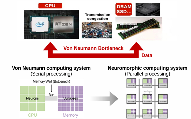 그림 3. 폰 노이만 컴퓨팅 구조와 뉴로모픽 컴퓨팅 구조의 개념도 및 Memory wall 현상[2]