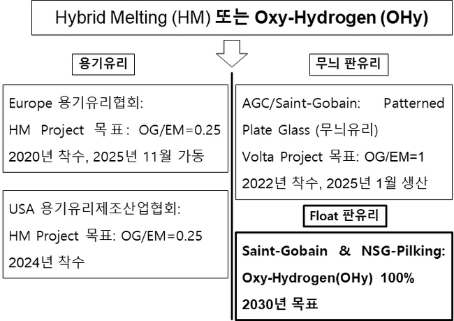 ■2024년 독일 Duesseldorf Glastec 전시 내용 중에서 Float 유리 용해로를 대상으로 한 탄소배출 감축관련 보도자료에 따르면[35], 유럽에서 가동되는 cross-fired regenerative float 용해로의 수명은 (최대 온도 약 1650℃에서) 15∼20년에 이르는데, 현재의 OG 연소 시스템으로는 더 이상의 탄소배출 감축이 가능하지 않으므로 Saint-Gobain과 NSG-Pilkington은 각각 다음과 같이 Oxy-Hydrogen(이하 OHy) 연소시스템 도입 전략을 채택하고 있다.