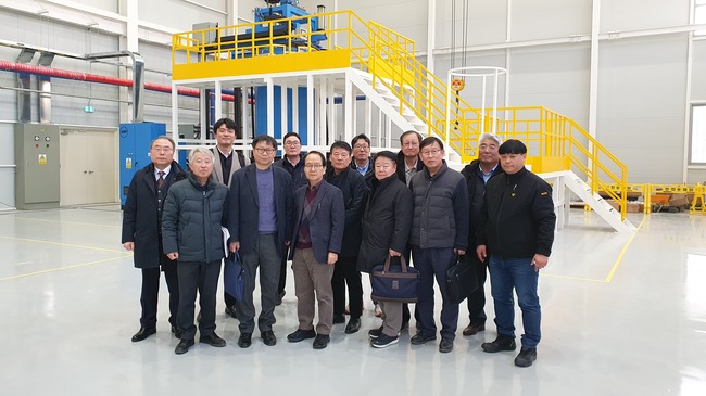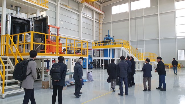 간담회 참석자들이 김동준 강원TP 신소재센터 과장 안내로 구축장비 견학을 하고 있다.