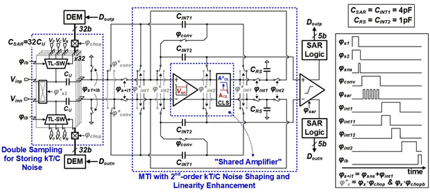 이정협 교수팀은 이 난제를 해결하기 위해 발생하는 샘플링 열잡음(온도 등 외부 요인에 의해 발생하는 불규칙한 신호 간섭)을 고주파 영역으로 밀어내어 제거하는 ‘노이즈-쉐이핑 SAR ADC(Noise-shaping SAR ADC)’ 구조를 새롭게 제안했다.