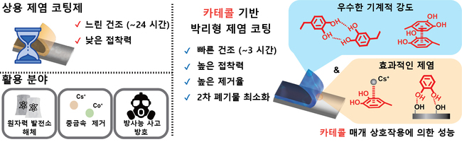 카테콜은 홍합의 접착 단백질에서 유래한 화학 물질로 벤젠(C6H6) 고리에 알코올기(OH)가 두 개 붙어있는 페놀 종류이며, 다양한 표면에 강하게 부착할 수 있는 특성을 가진다. 이에 연구원 원자력시설청정기술개발부 양희만 박사 연구팀과 UNIST 이동욱 교수팀은 카테콜 물질을 폴리우레탄 고분자 사슬 말단에 합성해 강력한 접착력을 갖는 제염 코팅제를 개발했다.