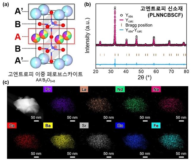 이를 바탕으로 전극 구조 안에서 금속 원소가 들어가는 자리(A-site)에 7종의 금속 원소(Pr, La, Na, Nd, Ca, Ba, Sr 등)를 동시에 도입한 ‘고엔트로피 이중 페로브스카이트 산소 전극’을 설계했다.
