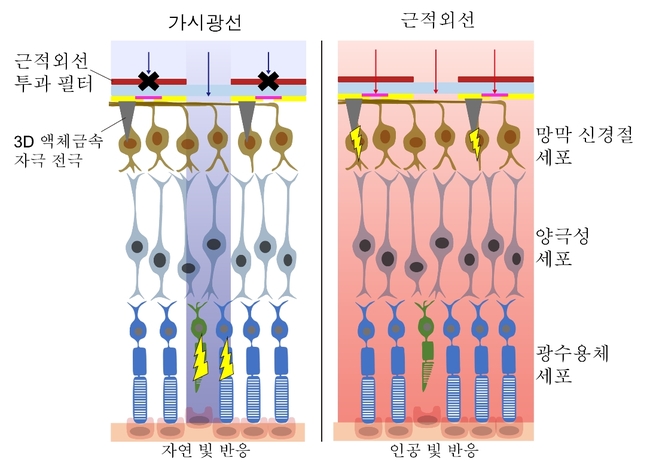연구팀은 근적외선을 감지해 전기 신호로 바꾸고 망막 신경을 자극하는 초소형 인공망막 장치를 개발했다. 이 장치는 근적외선을 잡아내는 ‘포토트랜지스터’, 가시광선은 투과시키고 근적외선만 선별하는 ‘초박막 필터’, 그리고 안구 조직에 밀착되는 유연한 ‘3차원 액체금속 전극’으로 구성된다.