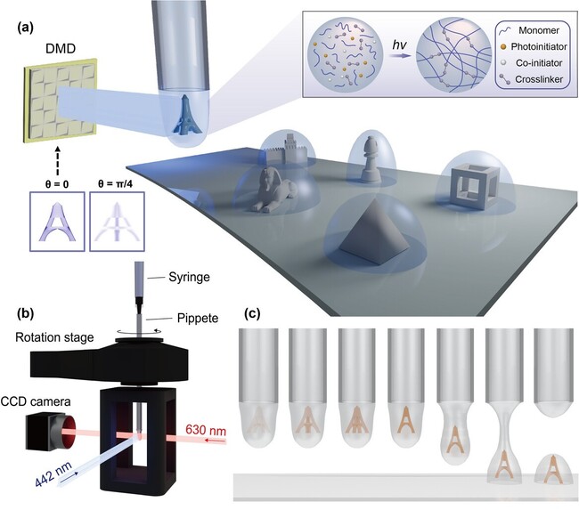 개발된 디스펜싱 체적 3D 프린팅 기술은 피펫 끝에 맺힌 액체 원료 방울에 빛을 쏴 원하는 모양대로 굳혀(경화) 형상을 만드는 방식이다. 형상이 다 경화되면 공기압으로 피펫에서 액체 방울을 밀어내고, 새로운 액체 방울을 만든다.
