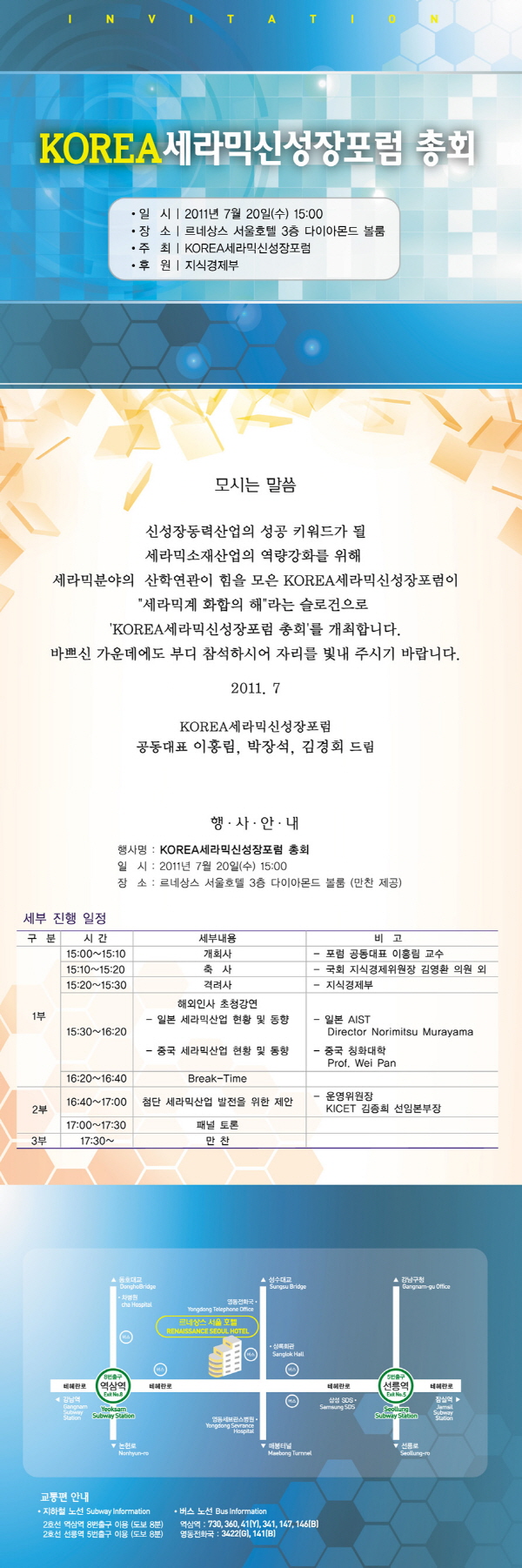 'KOREA세라믹신성장포럼 총회'를 7월 20일(수) 서울 역삼동 소재 르네상스 호텔에서