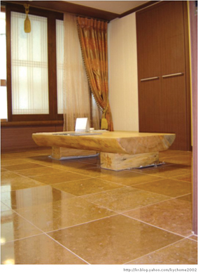 7_ 거실의 바닥재로 쓰인 황토다. 황토는 친환경상품의 대표주자로서 실내환경의 집먼지나 진드기를 제거해주는 동시에 내부의 분위기 또한 아늑하게 만들어주는 역할을 한다.