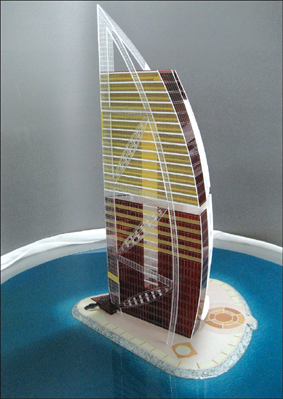 쪾투명한 태양전지를 두바이의 버즈알아랍 호텔 빌딩 유리창으로 적용한 모형으로 유리창에서 생산된 전기를 이용하여 엘리베이터 구동