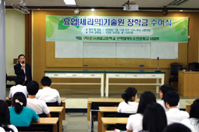 요업기술원은 지난달 17일 구미전자공업고등학교(교장 박성권)에서 김광진 선임연구본부장(원장직무대행)의 CEO 특강, 전문가 특강 및 우수학생으로 선발된 다섯 명에 대한 장학금 전달식을 가졌다. 구미전자공고와는 2006년 11월에 ‘1사1고’ 운동의 일환으로 자매결연을 맺었으며, 지난 7월 8일~11일에는 학생 6명에 대한 요업기술원 현장실습 프로그램을 실시한 바 있다. 80여명의 남녀 학생들을 대상으로 열린 CEO 특강에서 김광진 박사는 ‘비전과 긍정적 사고로 미래열기’라는 주제로 한 시간동안 열강을 이끌어 갔으며,‘비전, 어떻게 만들고 어떻게 이룰 것인가?’,‘사람이 세상과 연결되는 4가지 접점’, ‘무지개 원리’ 등의 다양한 소주제를 이용한 강연을 통해 청소년들에게 꿈과 희망을 북돋아 주었다.